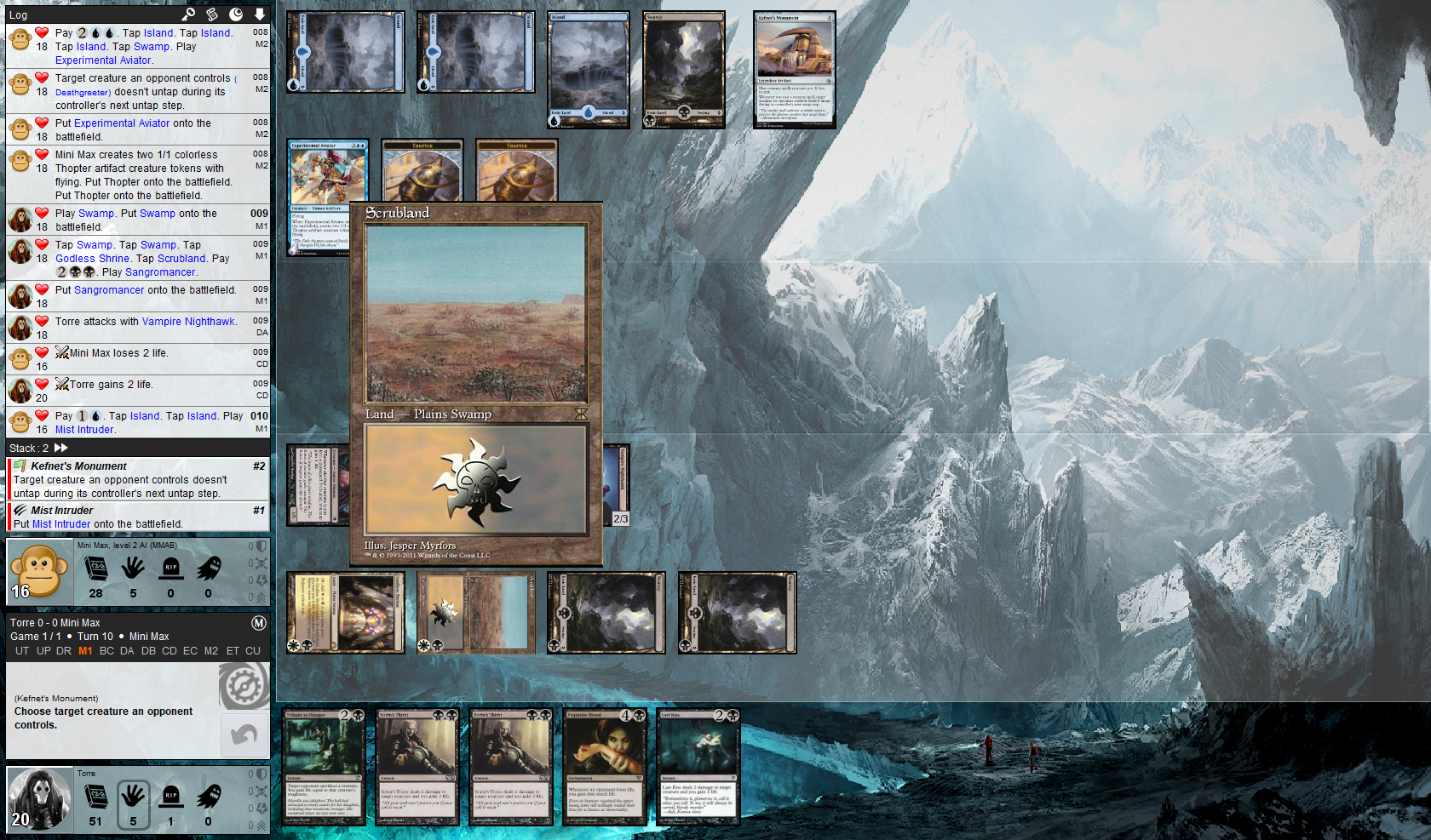 Thanks for the logs and screenshot, very helpful. The battlefield does not look particularly busy but looking at the crash.log, the VM memory allocation looks suspect. Max Memory should be at least 512M which launch4j should be setting. Are you running Magarena.exe or the Magarena.jar directly?jerichopumpkin wrote:crash report.