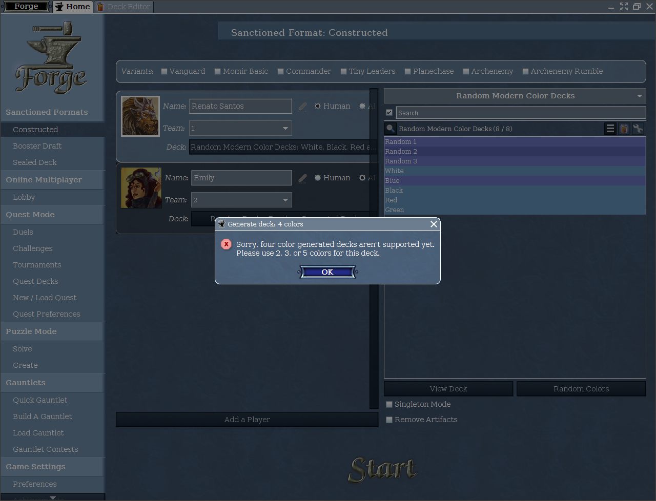 - Trying to set up a random 4-color Modern deck resulted in the situation shown below.