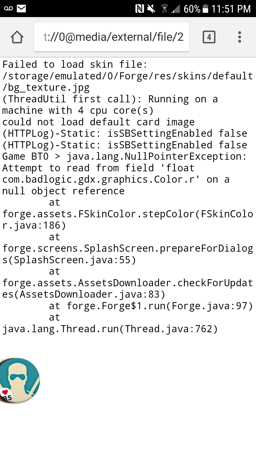 Please post the contents of the Forge.log file after trying to launch the game (check the data folder in the Forge installation directory).AuranReign wrote:I've just got a new Samsung galaxy s7 active, and the game will only open to a blank black screen. I saw that this was a known issue for tablets (though mine isn't a tablet), so I tried the troubleshooting of setting to portrait mode, but it didn't help.