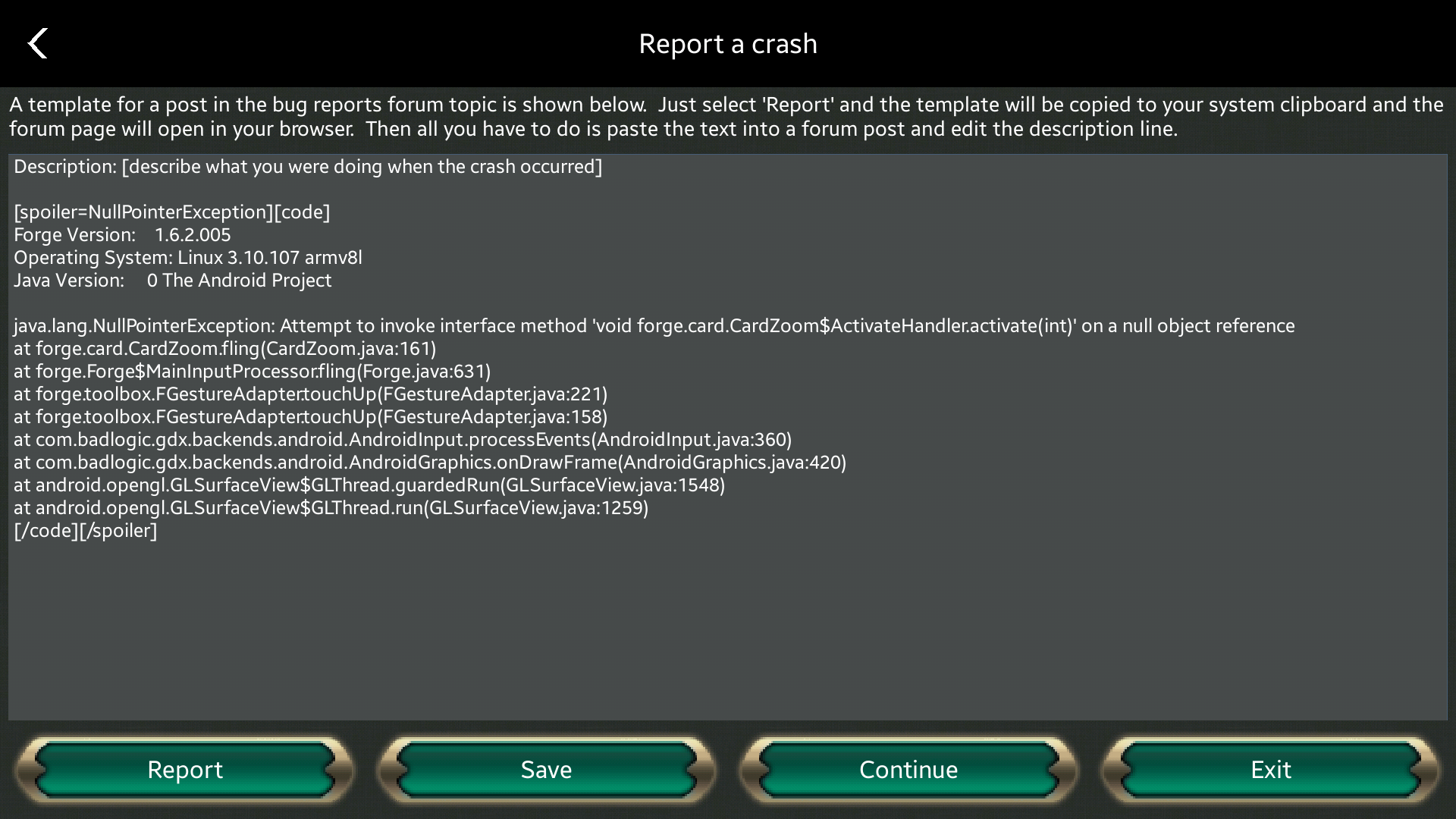 Hmm, this is really odd :/ What's even more funny, it doesn't happen when running libgdx Forge on PC (e.g. in debug mode). I'll need to think why this might be happening.kevlahnota wrote:On android, You can activate opponents stack ability or cast stack cards when zoomed. Then NPE when you try activating or casting the stack card/ability.Screenshot_20170906-025452.pngScreenshot_20170906-025510.png