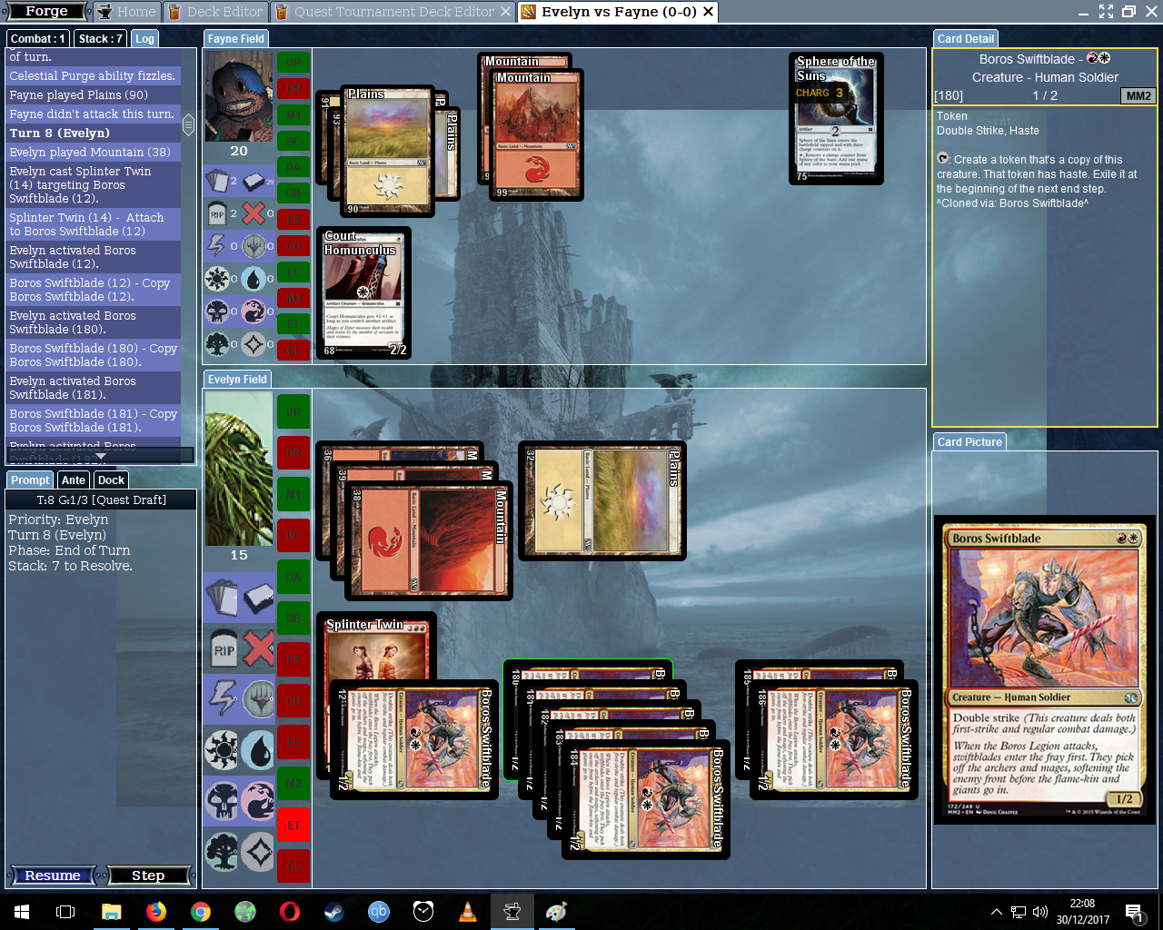Splinter Twin isn't working correctly for the AI. When duplicating a card enchanted by Splinter Twin they duplicate it infinitely by tapping the duplicated card (Enchantment effects get duplicated with the clone I am guessing). The clone does not have a visual copy of Splinter Twin.