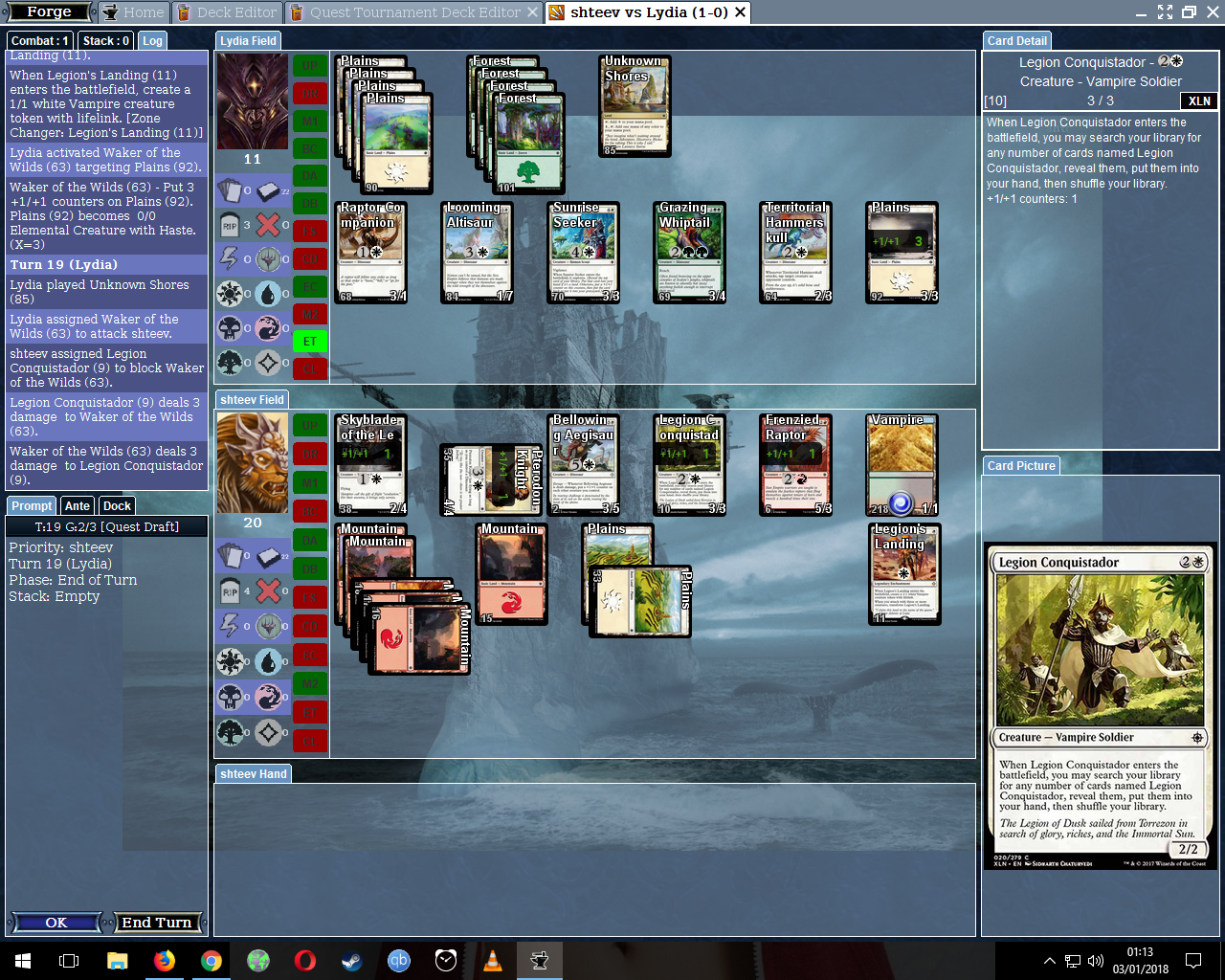 Just as an example of what I'm talking about: I've just had the AI reach it's end of turn step, I activated my Quest Mode Plant Token to gain a life, and in response the AI cast a Plumeveil. Props to the AI for trying something tricky, but in practice I'm almost always going to activate a Plant Token at the end of his turn when I'm in Quest Mode.shteev wrote:It seems to me like the AI currently waits to play creatures with the flash ability until after I have performed some kind of game action, in order to catch me out.