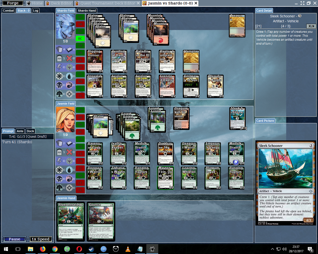 Just as an example of what I'm talking about: I've just had the AI reach it's end of turn step, I activated my Quest Mode Plant Token to gain a life, and in response the AI cast a Plumeveil. Props to the AI for trying something tricky, but in practice I'm almost always going to activate a Plant Token at the end of his turn when I'm in Quest Mode.shteev wrote:It seems to me like the AI currently waits to play creatures with the flash ability until after I have performed some kind of game action, in order to catch me out.