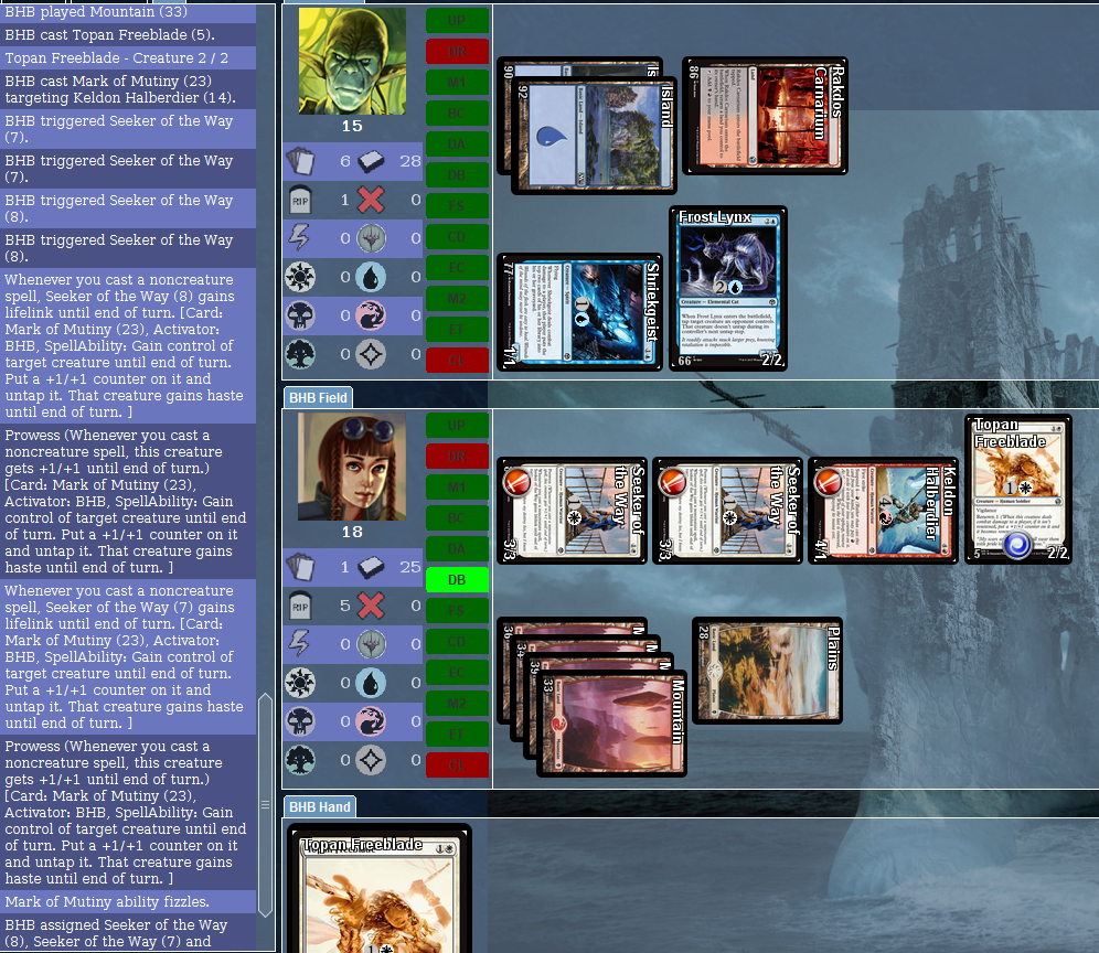 I cast Mark of Mutiny on my own creature, triggering prowess and the lifelink from both my Seeker of the Way. Mark of Mutiny fizzles for no apparent reason.