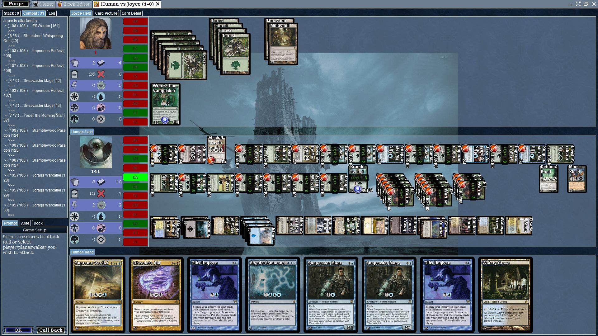 Splinter Twin isn't working correctly for the AI. When duplicating a card enchanted by Splinter Twin they duplicate it infinitely by tapping the duplicated card (Enchantment effects get duplicated with the clone I am guessing). The clone does not have a visual copy of Splinter Twin.