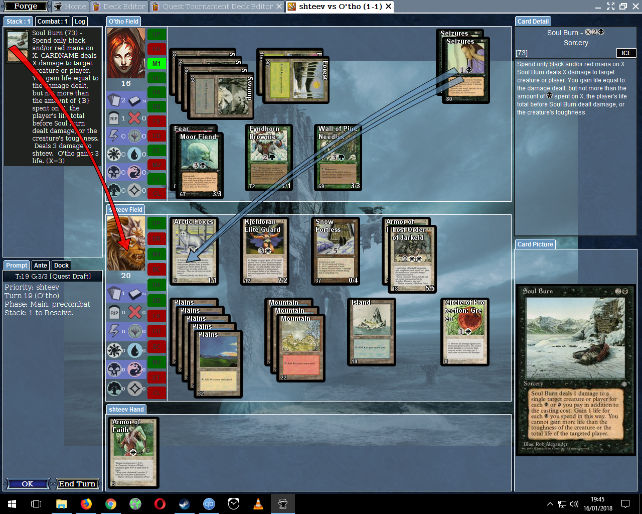 We're firmly in the midgame here, both life totals still high, and the AI targets a Soul Burn at me instead of using it to gain advantage on the board by killing a creature.