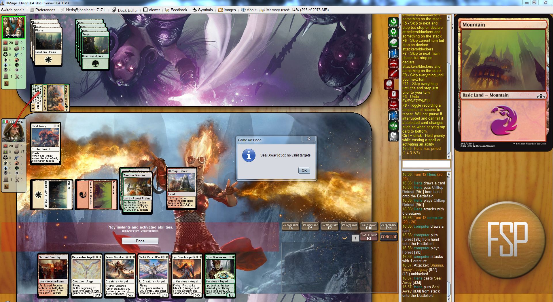 In a match against a human opponent i couldn't target Shanna, Sisay's Legacy with Seal Away, i clicked on her but nothing happened. I tested the same situation against AI and a window popped up telling that Seal Away had not valid targets. Targetting Shanna, Sisay's Legacy with a spell should be possible as the rules at http://gatherer.wizards.com/Pages/Card/ ... eid=443092 say