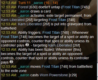 In Vintage Cube Sealed against a human opponent, I cast Bribery and stole his Frost Titan. He then tried to exile it with a 3-Loyalty Karn Liberated - and the Titan trigger to make him pay more targeted the Karn, then fizzled because Karn went to the graveyard. It should have targeted the player (and resolved). As it was, he was able to exile the Frost Titan without paying any extra mana.