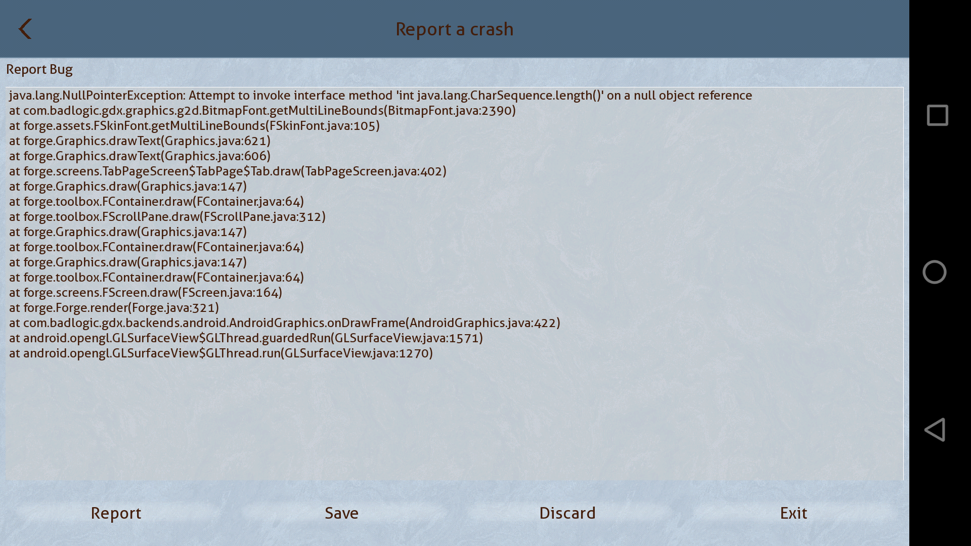 I think we have this issue in the tracker, but it's not an easily resolvable one.Ronin009 wrote:Android Forge still has a critical game breathing bug that has yet to be addressed: Anytime While playing the game, if I am interrupted by a phone call or I temporarily switch windows to another app, the game either resets itself or the text & images become a garbled mess making it impossible to continue playing.