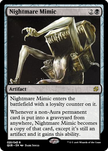 Oracle:Nightmare Mimic enters the battlefield with a loyalty counter on it.\nWhenever a non-Aura permanent card is put into a graveyard from anywhere, Nightmare Mimic becomes a copy of that card, except it’s still an artifact and it gains this ability.