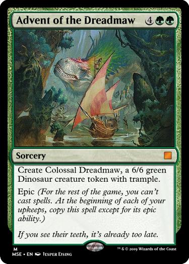 Oracle:Create Colossal Dreadmaw, a 6/6 green Dinosaur creature token with trample.\nEpic (For the rest of the game, you can't cast spells. At the beginning of each of your upkeeps, copy this spell except for its epic ability.)