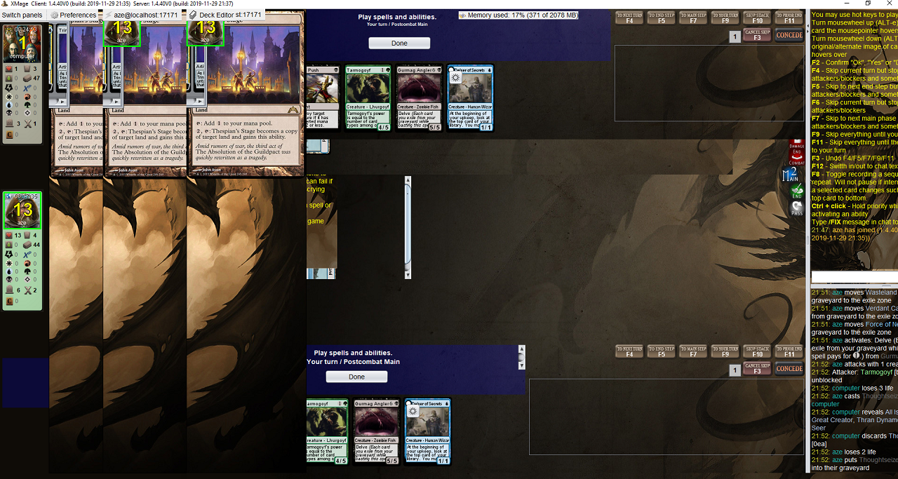 Can you make screenshot? XMage doesn't have full screen or close chat buttons -- it's must be third app or window manager in linux systems.NotNotNot wrote:If you click the button to full screen the in game chat it freezes the program. This has been like this for YEARS. This button is DIRECTLY next to the button to close the chat. These buttons are VERY tiny and it's easy to misclick the fullscreen button when trying to close the chat. When you freeze the program this way you can not reconnect. I've misclicked this button in the middle of so many games over YEARS now, I don't understand why it's even still there.