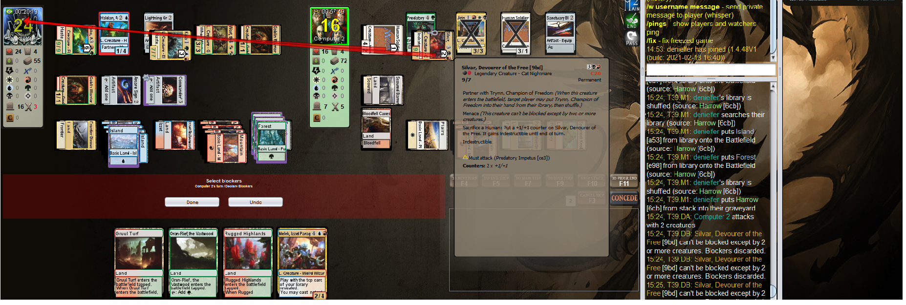 hey. I was playing against 3 AIs and at the end game was 1v1 and I cast "Predatory Impetus" ( the important part on this is "... must be blocked if able..." ) on a "Silvar, Devourer of the Free" ( it has Menace ) and I had only 1 creature to defend so when he attacks I'm forced to place a defender on Silvar but because i only have 1 it can't be blocked and I get a warning if I don't put blockers I get a warning saying I have to block Silvar because Predatory Impetus.