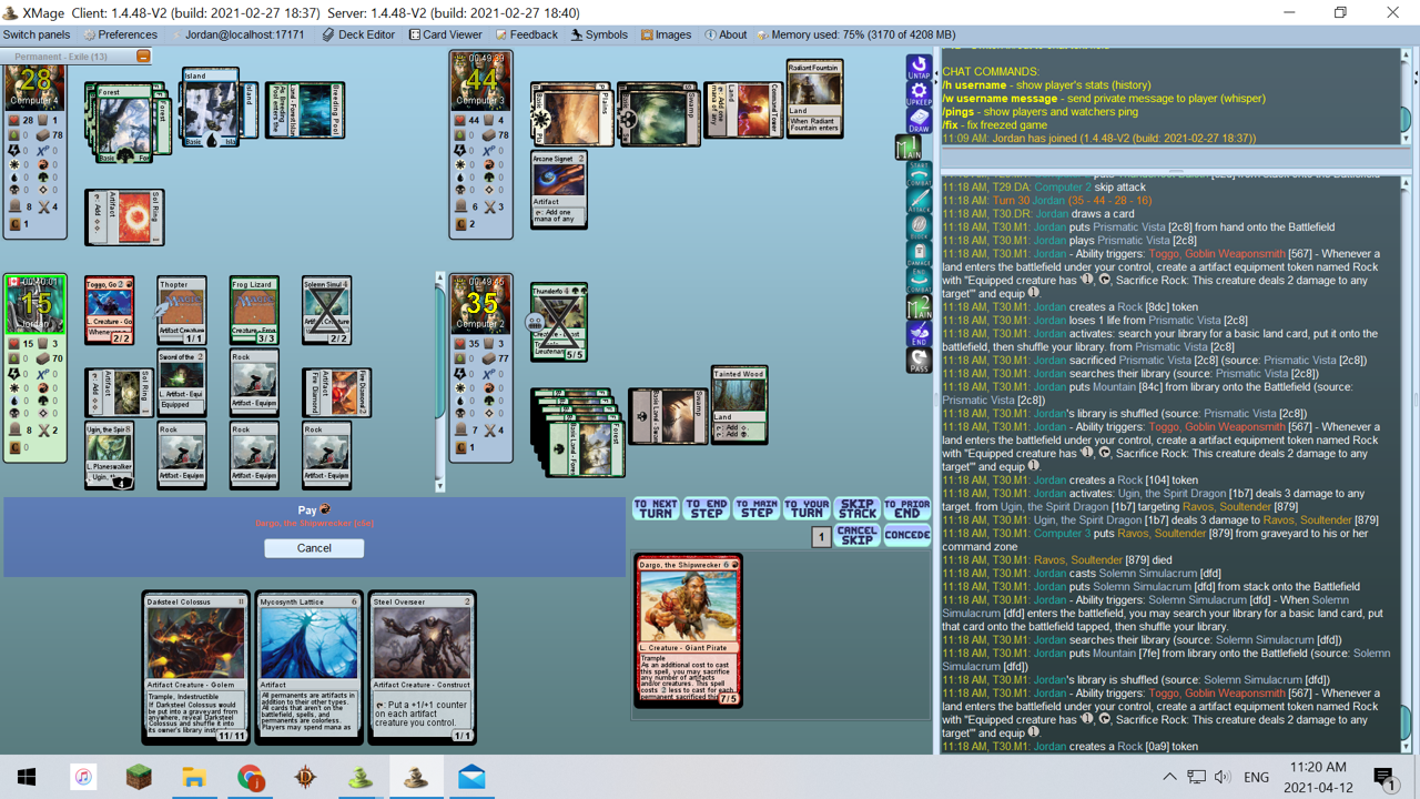 Dargo only ever costs 1. I can't figure out what is triggering him, or why. However, this is incorrect.Legioned wrote:Dargo, the Shipwrecker appears to consider all cards sacrifices so far the entire game as opposed to this turn. I never payed more than 1 mana all game for him, which I am certain is incorrect.