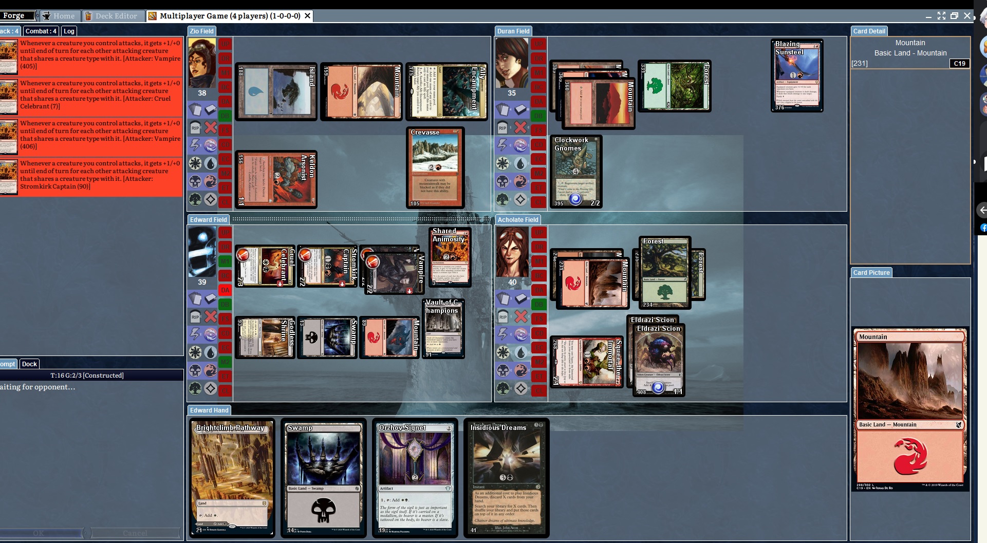 I found a bug on the latest release of Forge 1.6.39. Anytime I attack with Shared Animosity on the field, the game crashes at Waiting for opponent.
