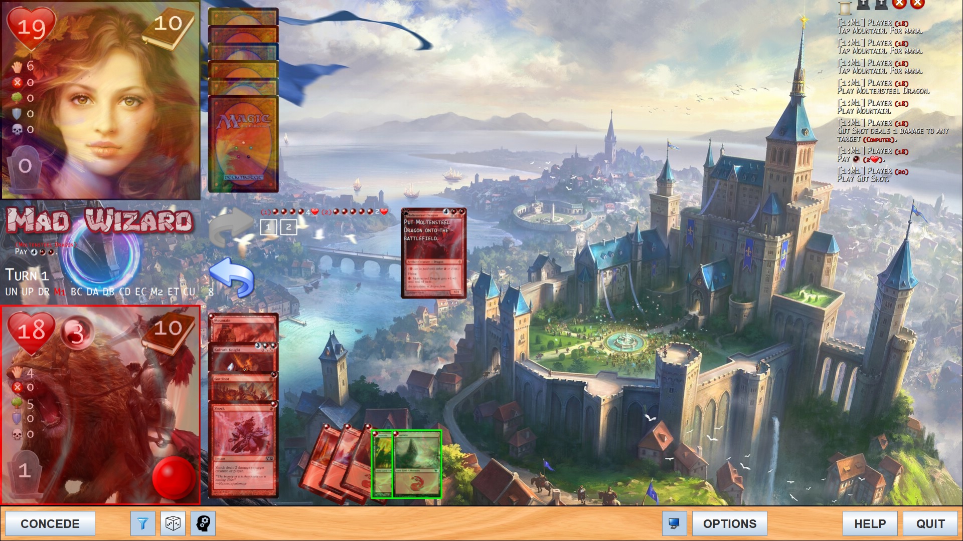 The Moltensteel Dragon is played. The player is asked to either pay 4 red mana and 4 life or 5 red mana and 2 life which are the only possibilities. The player taps 3 Mountains for mana.