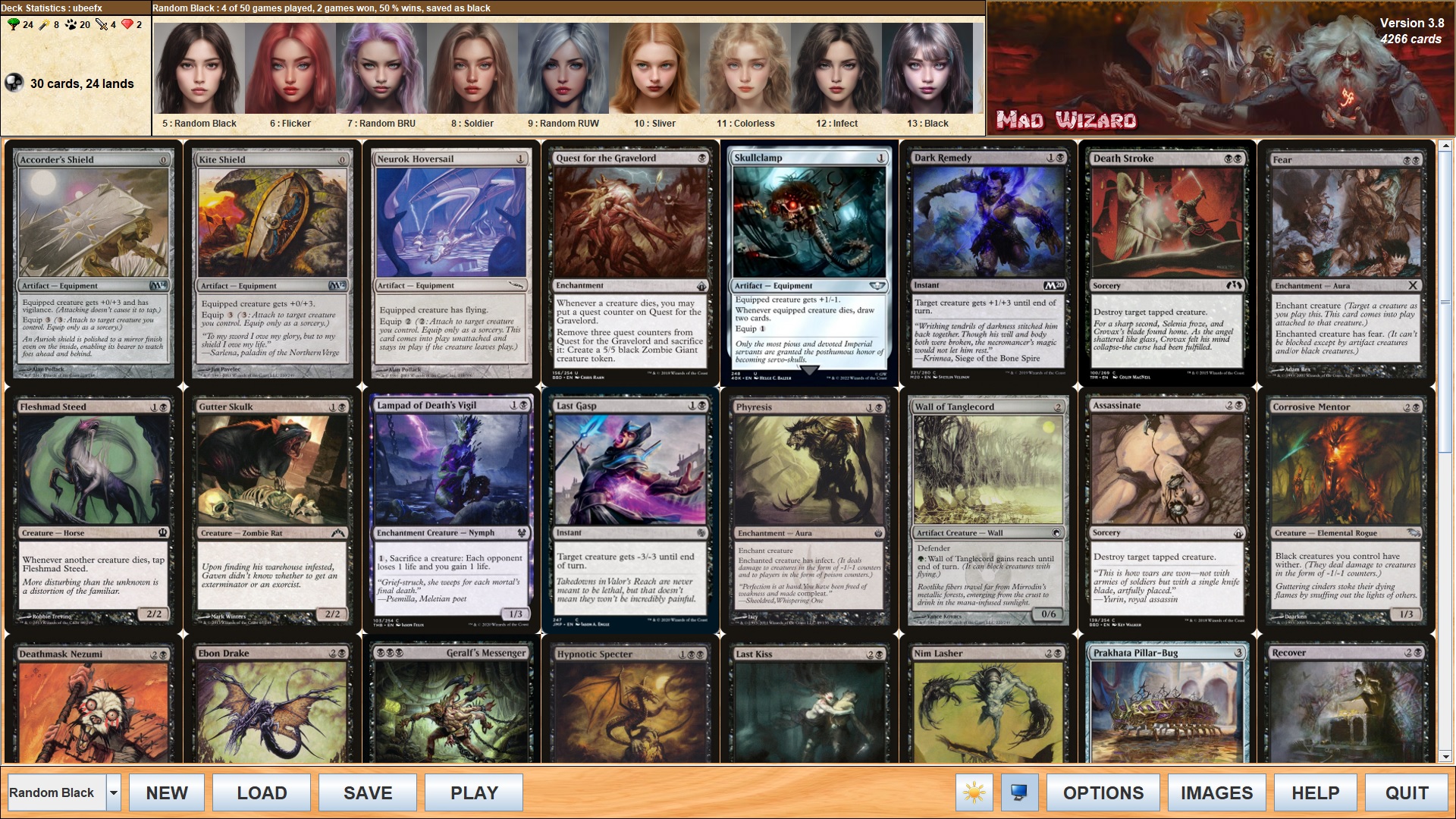 I am really enjoying playing Mad Wizard, and wanted to say so. I am about halfway through a campaign with the Green deck, and have a 59% win ratio which shows that that game is a good challenge.