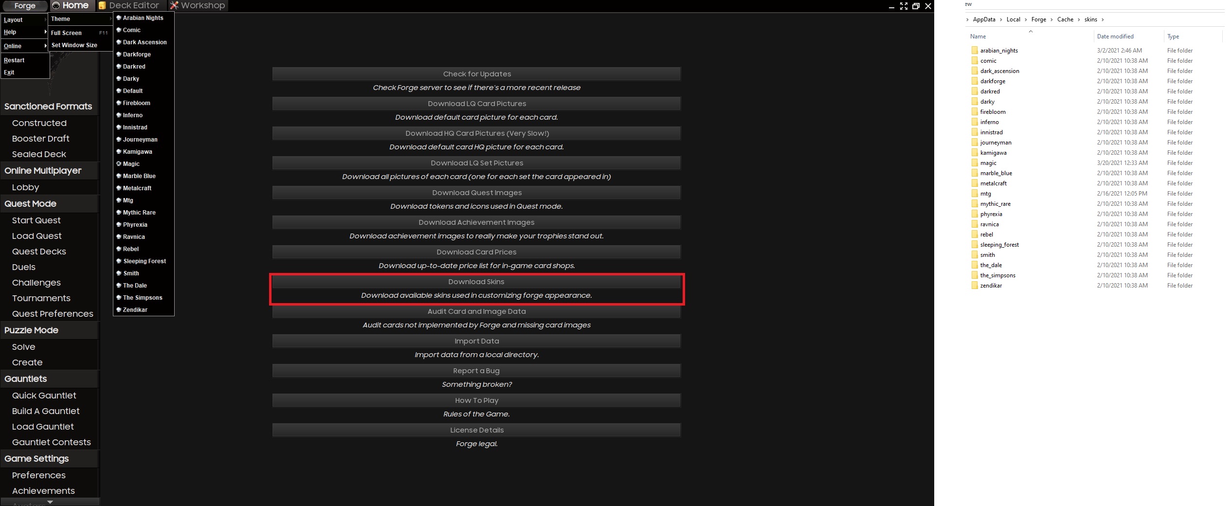 The custom user skins will need to be moved to the Forge cache folder (the same folder where your "db" and "pics" folders are - create the "skins" folder there and move all the skins into it except for the "default" skin folder, which should still be under res/skins). It requires an extra action right now but it'll allow you not to risk losing your custom skins every time you update Forge.McTulus wrote:In the new release, I can't change the skins from default to any other type despite the file is located in the same place as before. DOes anyone know how to fix it?