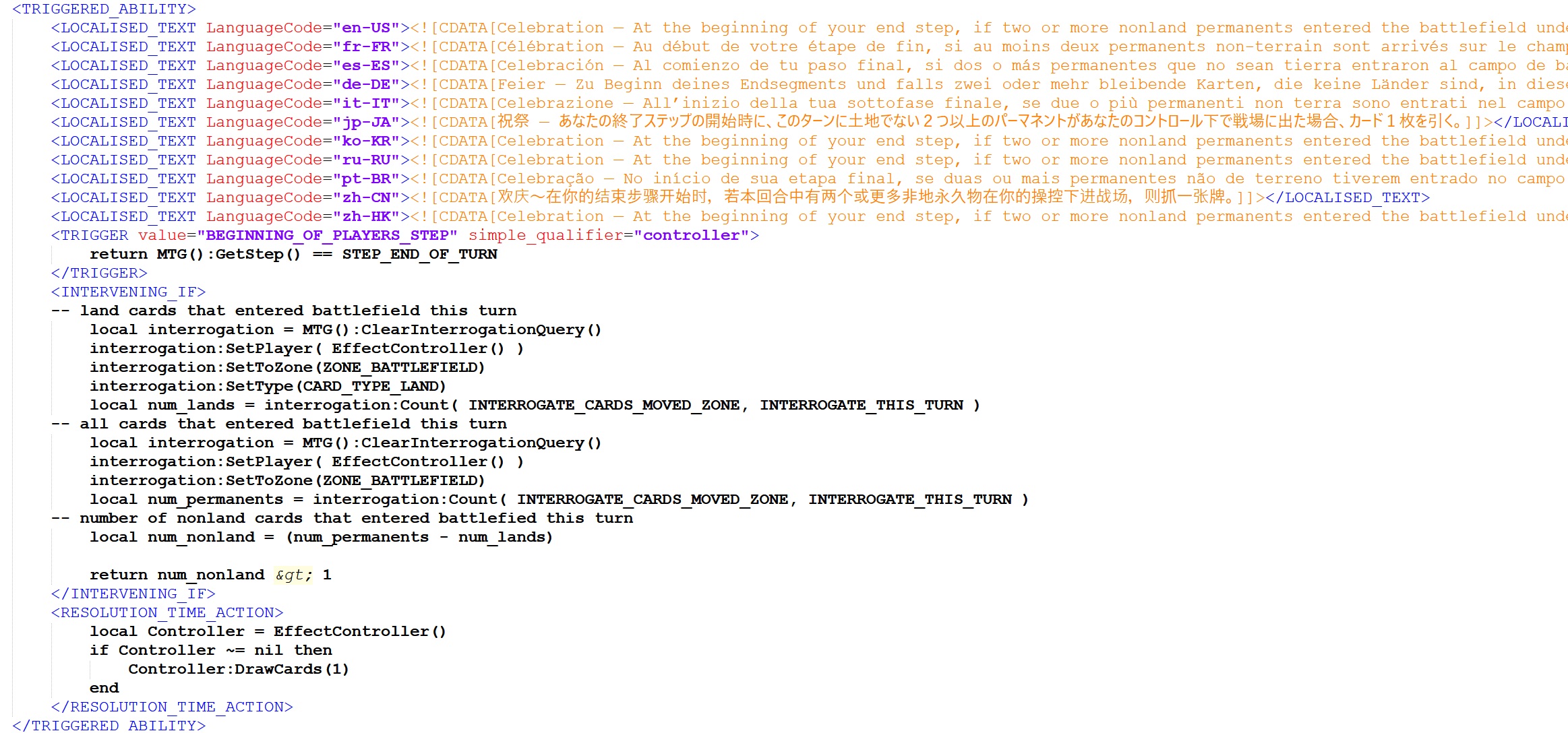 About workarounds i noticed that some new cards have some function similar to old ones, for example the "bargain" atribute i mentioned on the edit of my first post, at first i believed it was imposible but the "kicker" function was really similar so i used it as a workaround, the cards in question do what they should , the problem its that i cant change the ingame display of "kicker", atm im struggling with the "celebration" cards, again probably the key for them is in the code for "landfall" i just need to figure a way to make them count nonlandpermanents instead of lands.