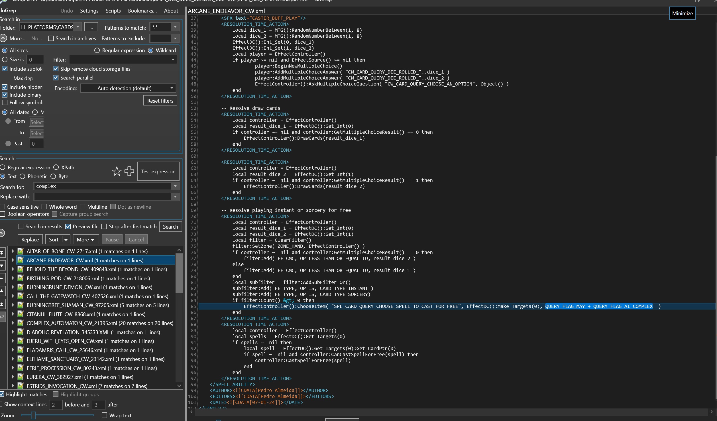 Im using your version of the game etphonehome , the one you posted on another post, its just that a was tired of playing the game with always the same cards and wanted to give coding new ones a try, im using notepad++ with xml pluging, and i really apreciatte the DnGrep advice cause im always wasting a lot of time looking trought the code of similar cards in the builder.