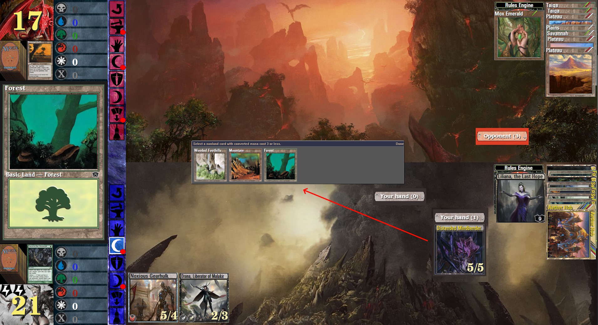 I've noticed that after casting Distended Mindbender when the opponent doesn't have any non-land card in his hand, there is no way to close the card selection panel. I obviously cannot select any land card and clicking on "done" doesn't actually dismiss the panel itself, so killing the game process and reloading a save is the only way to bypass the issue.