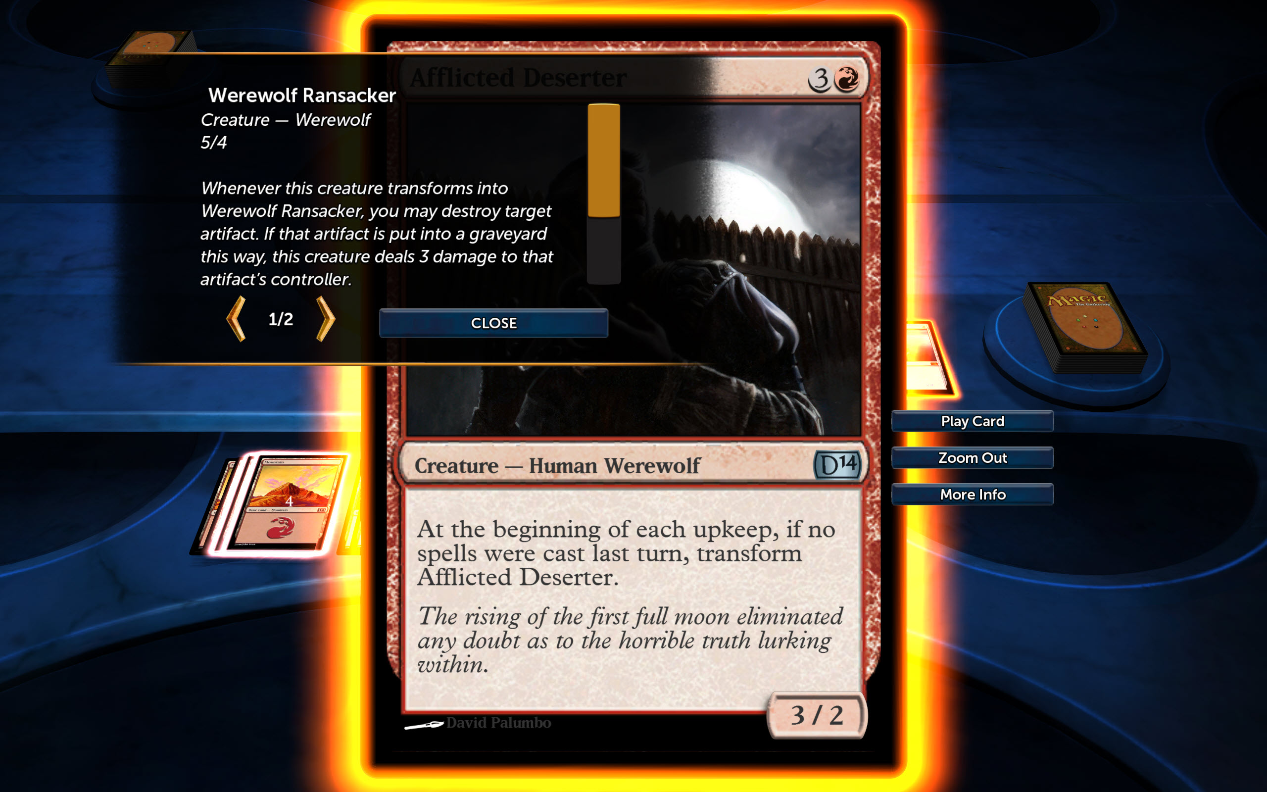 Transform cards are now "supported" also in "my version". They already existed, were finely coded and don't interfere with framerate. I didn't included them already because there was no way of knowing in what card it was transforming into and you couldn't play accordingly. But i've included this info now and you can get the info about the card the the transforming card will transforme into, Just Zoom the card and click "More Info" button to check the description about the card to transform into, Phyrexia: All Will Be One cards are coded and checked. Only some cards from it's Commander are missing (the hard ones). Maybe ,next, i'll be coding the transform cards left behind and try to code Prototype cards before moving to newer sets.