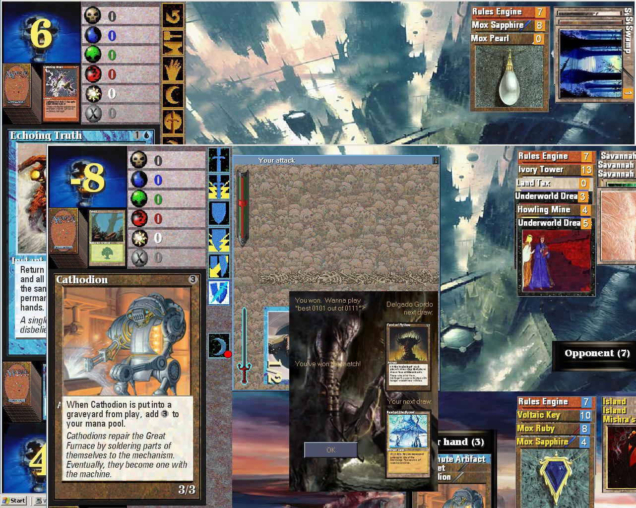 Sweet! Managed to transmute artifact a mana vault into darksteel colossus by using voltaic key and master transmuter on my mana vault and then saccing it, then kept myself alive by bouncing all AI's underworld dreams twice with echoing truths.