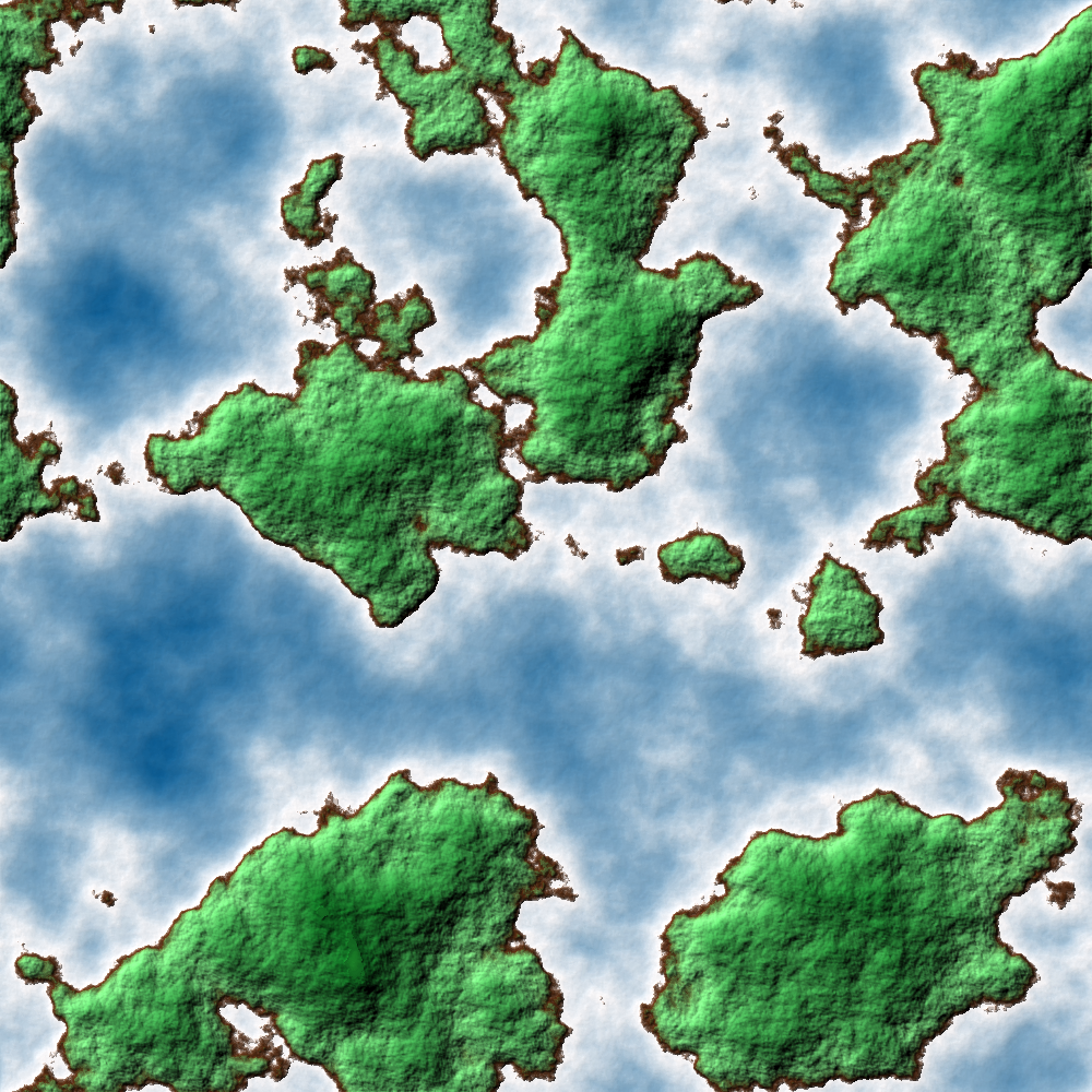 As for maps, GIMP can generate maps. I'll include a few generated maps here; they can also have their color schemes changed for different lighting and weather conditions. The maps are from a game I'm making, but they serve as a demonstration of what is possible. These are high res, but they're also more of a continent/global perspective rather than a local map perspective.