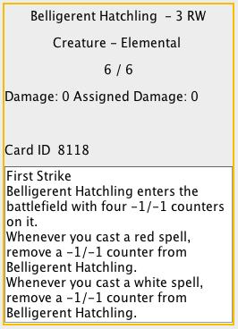 If no-one has an objection, I will merge my code into the SVN and will start updating the cards that I can find that could use this feature. One example that comes to mind is Belligerent Hatchling. I will attach three jpgs to give people a before and after image of this one card.