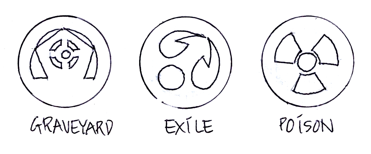 I don't get the graveyard one. I like exile and poison. Perhaps graveyard could just be a headstone with RIP? Cliche, I know, but it's definitely clear.choppic wrote:Icon ideas for graveyard, exile, and poison counter.
