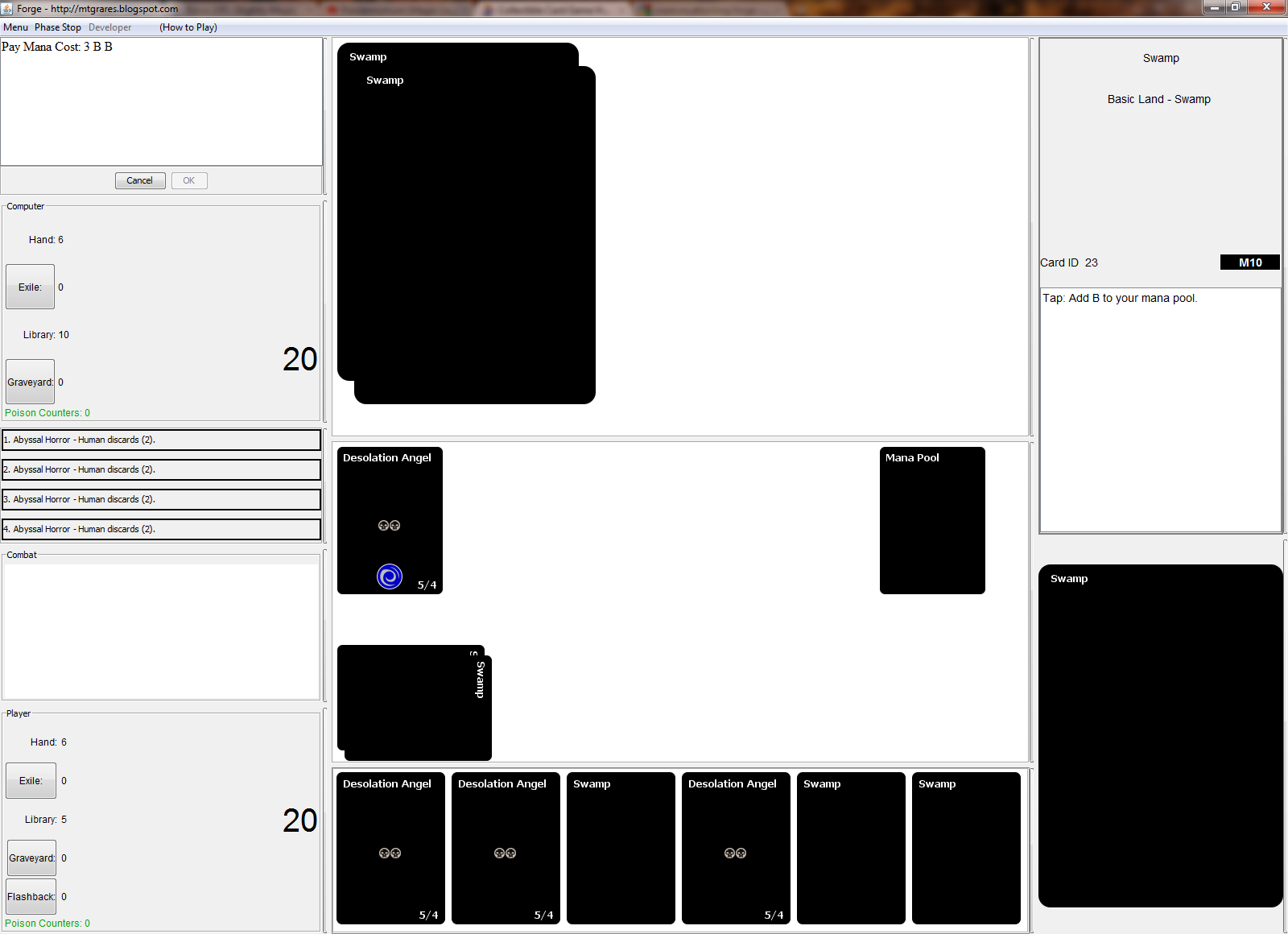 Withe your added ValidCard restriction, the card worked fine here. May have been something related that someone else fixed elsewhere. I'll add your fix though, thanks!jeffwadsworth wrote:I was testing Desolation Angel implementation with triggers. When it triggered, 4 Abyssal Horror discard 2 messages stacked up. There were no cards of this type in either deck. Please disregard the cost of the cards...test.