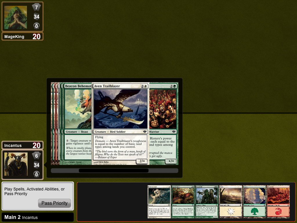 The screenshot doesn't capture the interaction (the scrollbar on the bottom lets you quickly go through all the cards - hopefully i can put up a youtube video soon). Any comments/suggestions? One thing i need to change is the selection interface for when you have to pick multiple cards from the zone (currently they move to an area above the zone display).