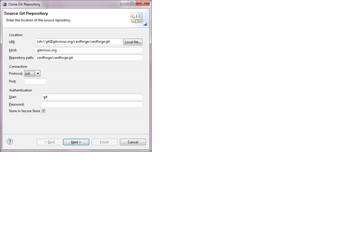 you need ssh://git@gitorious.org/cardforge/cardforge.git otherwise you get read only repository; you can change the push / pull url laterBraids wrote:that URI did not work for me. i used "git://gitorious.org/cardforge/cardforge.git" instead. Rob, is that a problem?Rob Cashwalker wrote:Find EGit in the eclipse "Help -> Install New Software" function. Install, restart eclipse. Then do "File -> Import...", select "Git -> Projects from Git". Click "Clone". The URI is "git@gitorious.org:cardforge/cardforge.git", then just "Next" and "Finish" until it's copied down.