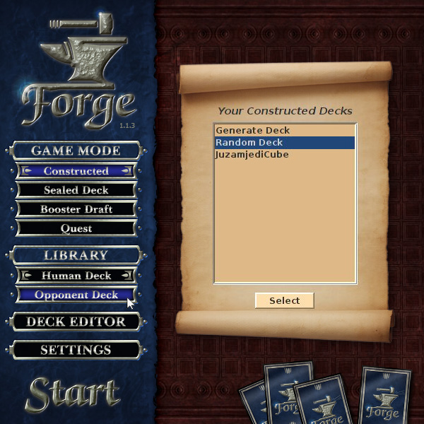 - by combination of clicking game mode and player, scroll is populated with deck options (all game type decks are listed as appropriate)