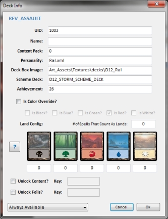 A deck editor for Duels of the Planeswalkers 2012. Requires that you use a cracked Magic2012.exe file ( this can be located on this forum; look for Casper's 2012 Custom Content ). The application allows you to create custom DLC ( default of DLC_1111 per Casper's 2012 Custom Content is setup when first running the application but you can create your own or more if you want ). It will also "pack" and move content to the DotP 2012 directory. Since I didn't have time to include help within the application I'll provide brief instructions below and will try to get it in the application as I have time.