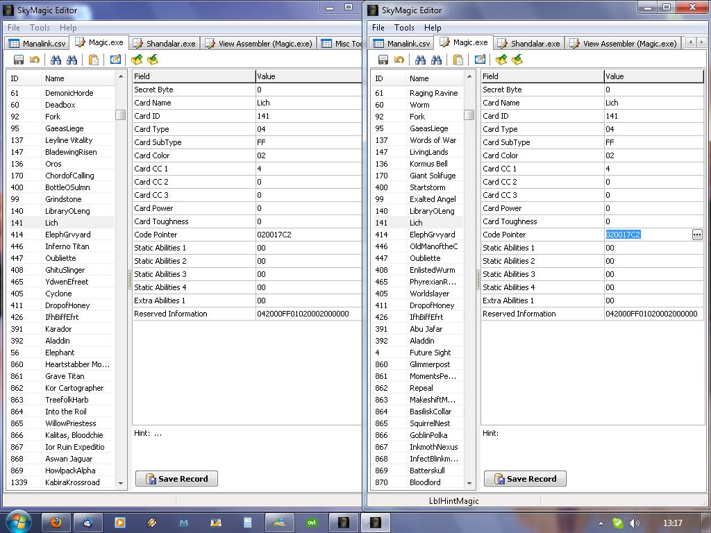 If you see that, by mistake, your Custom version has cards that work with other cards’ exe code, there is a nice tool that may be of aid. Within the same sub-window (Magic.exe) there is an icon that is like WinXP “go to desktop” button. It is “Card list” function: copy it, pate it to notepad, use the “replace” function to quickly delete all “numbers, x and _ “, then paste it to an empty Excel sheet. Sort all cards by name and search for duplicates: if you find any, then it means two things:
