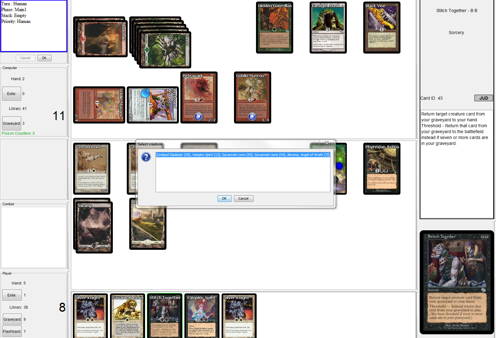 More news on Stitch Together: I cast it with threshold, and a few creatures in my graveyard. I got the same error, and the targeting dialogue was definitely buggy. See the attached image.gos wrote:I got this error when I tried to cast Stitch Together. 1 target in my graveyard, no threshold.