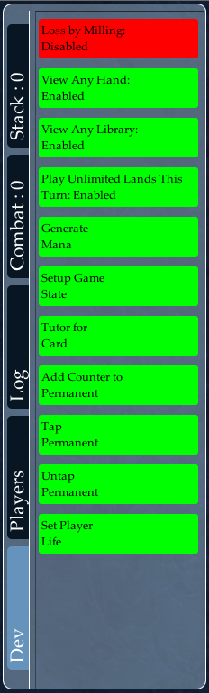 Yeah, this should really be disabled by default.FabioFLX wrote:I'm sure I have not selected that option, so check if the field is set by default in that build, please.friarsol wrote:That's a dev mode option to help us debug, look under the dev tab and make sure "Play Unlimited Land" is set to disabled.FabioFLX wrote:PS: [VERY IMPORTANT BUG] The latest snapshot (forge-1.2.0-20111223.121805-9.tar.bz2) lets players cast lands without the limit of 1 per turn!
