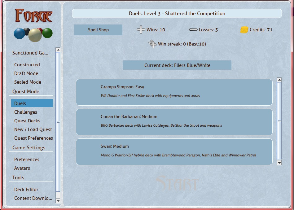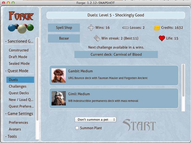 Here's my view of the quest mode duels. Notice I'm missing the Bazaar button, the life total, the line above the deck about next challenge, all the icons and the menu items at the bottom. The Challenges view is also missing the same stuff.Chris H. wrote:The quest mode Duels view should have a Bazaar button below the Spell Shop button.