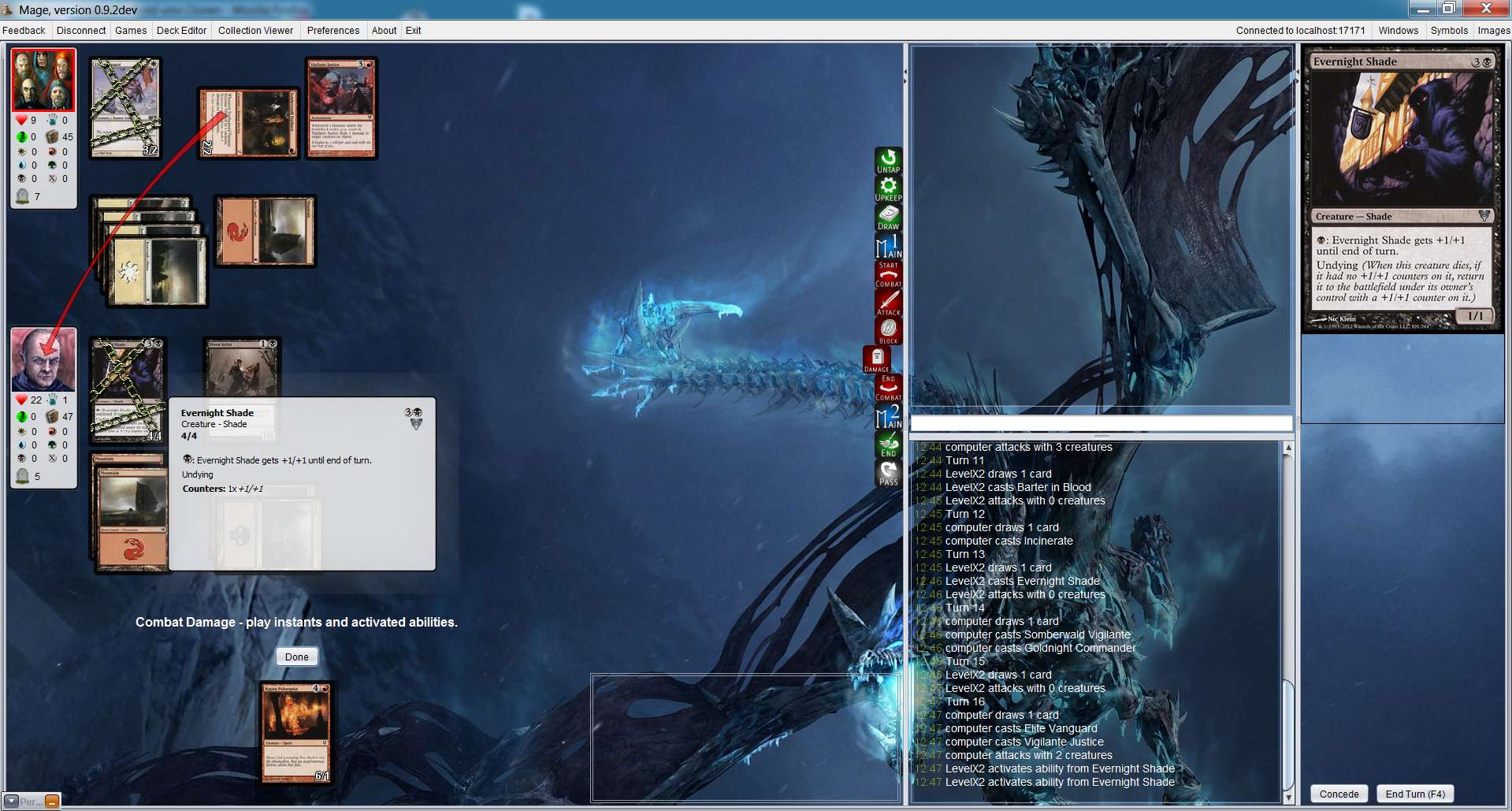 2) Turn 16: I block a 3/3 AI creature pumping the Evernight Shade 2 times with +1/+1 to a 3/3 creature.